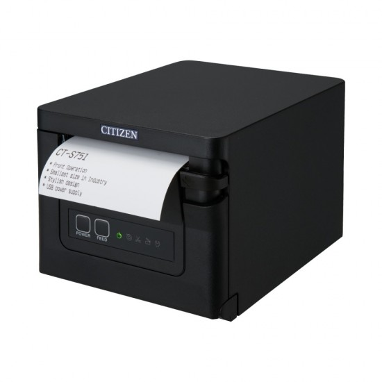 Ultra-fast POS printer with under counter mounting. The CT-S751 3-inch, modern design, premium functionality and seamless integration into mPOS systems makes it the perfect printer to meet the challenges of retail and hospitality industries. Available in black or white and with a small footprint and simple front-loading capabilities, the CT-S751 fits effortlessly into tight spaces and allows for tidy working areas. The printer can be placed under a counter to match the heights of a cash drawer or can be securely mounted with an optional bracket. Direct thermal 3" prints at 350mm/sec in 203 dpi. USB charging. Standard USB interface with Serial, Ethernet, Bluetooth and WiFi options available. Full and partial guillotine cutter.